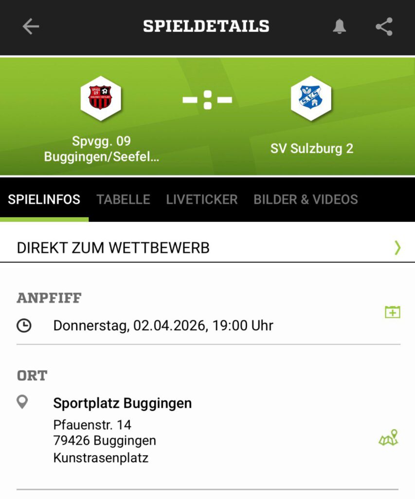 Am Donnerstag, den 02.04.2026, tritt unsere zweite Mannschaft auswärts in Buggingen an. Anpfiff des Spieles ist um 19:00 Uhr auf dem Kunstrasenplatz in der Pfauenstraße 14 .